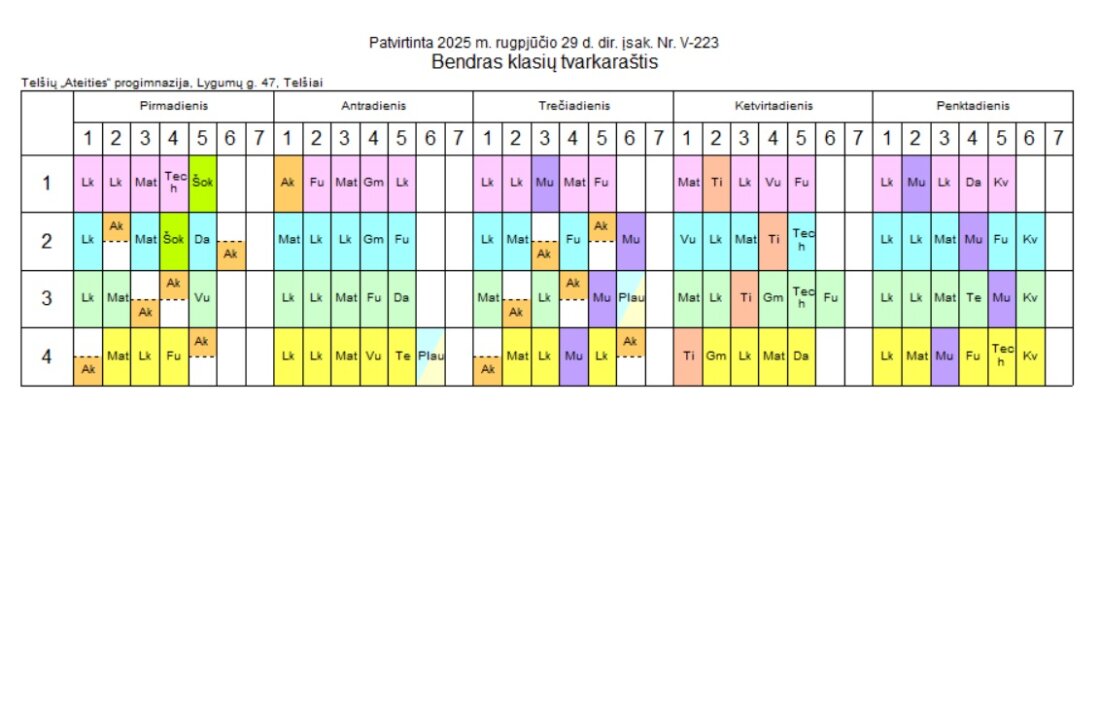 2025-2026 m.m. 1 pusmetis. 1–4 klasių pamokų tvarkaraštis „Saulėtekio“ skyrius